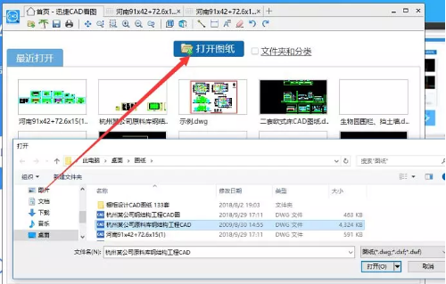 步骤二:然后双击打开运行该CAD看图软件,点击打开文件,并在指定的文件路径中上传我们要进行编辑操作的CAD图纸文件即可。