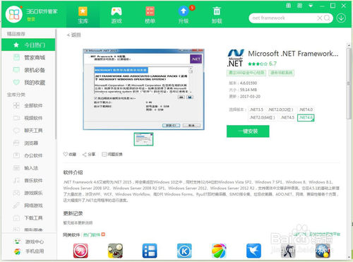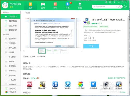 出现此问题是由于我们的系统缺少插件,那我们就来安装这个插件,我使用的是360软件管家安装NET软件(大家也可以去百度搜索下载安装)。选择以下图片红框里任意一款进行下载安装。