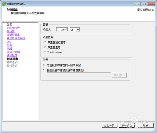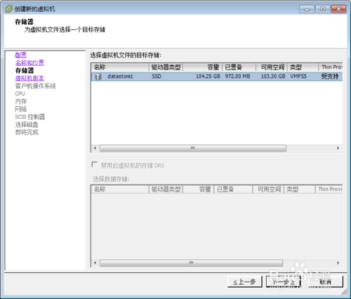 7.创建磁盘这里稍微讲一些,1,后置备延迟置零(性能中等,适合于做池模式虚拟桌面);2,厚置备置零(thick)(磁盘性能最好,时间长,适合于做跑运行繁重应用业务的虚拟机);3,精简置备(thin)(时间短,适合于对磁盘I/O不频繁的业务应用虚拟机),选择好后,下一步