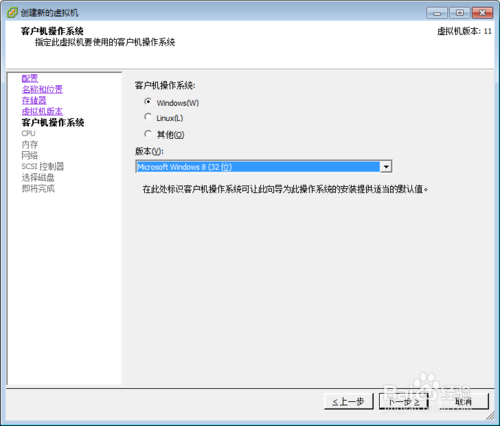 5.开始时,我们上传的是WIN8_X86的镜像,所以此时,我们选择Microsoft windows 8 (32位),选择好后,点击下一步,