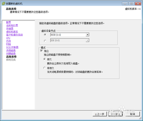 8.建议选择,虚拟设备节点选择SCSI(1:1),模式选择独立_持久