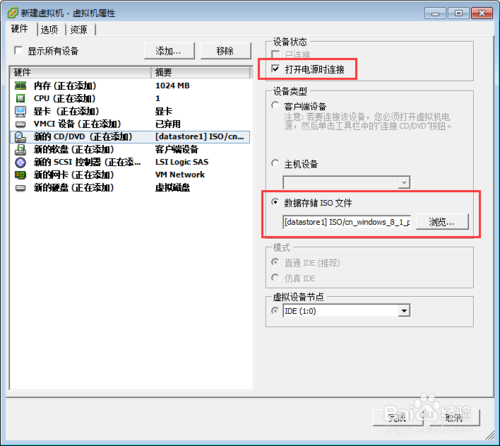 11.新的CD/DVD设置,如图所示,依次点击 数据存储ISO文件->浏览服务器文件找到之前上传的ISO镜像文件,最后千万别忘了勾选打开电源时连接。设置完后,点击完成即可。这个创建虚拟机需要几分钟,和个人版虚拟机不同。
