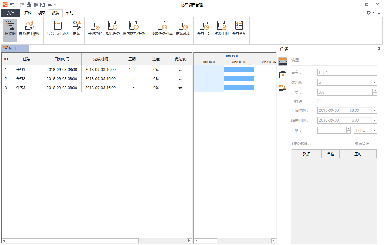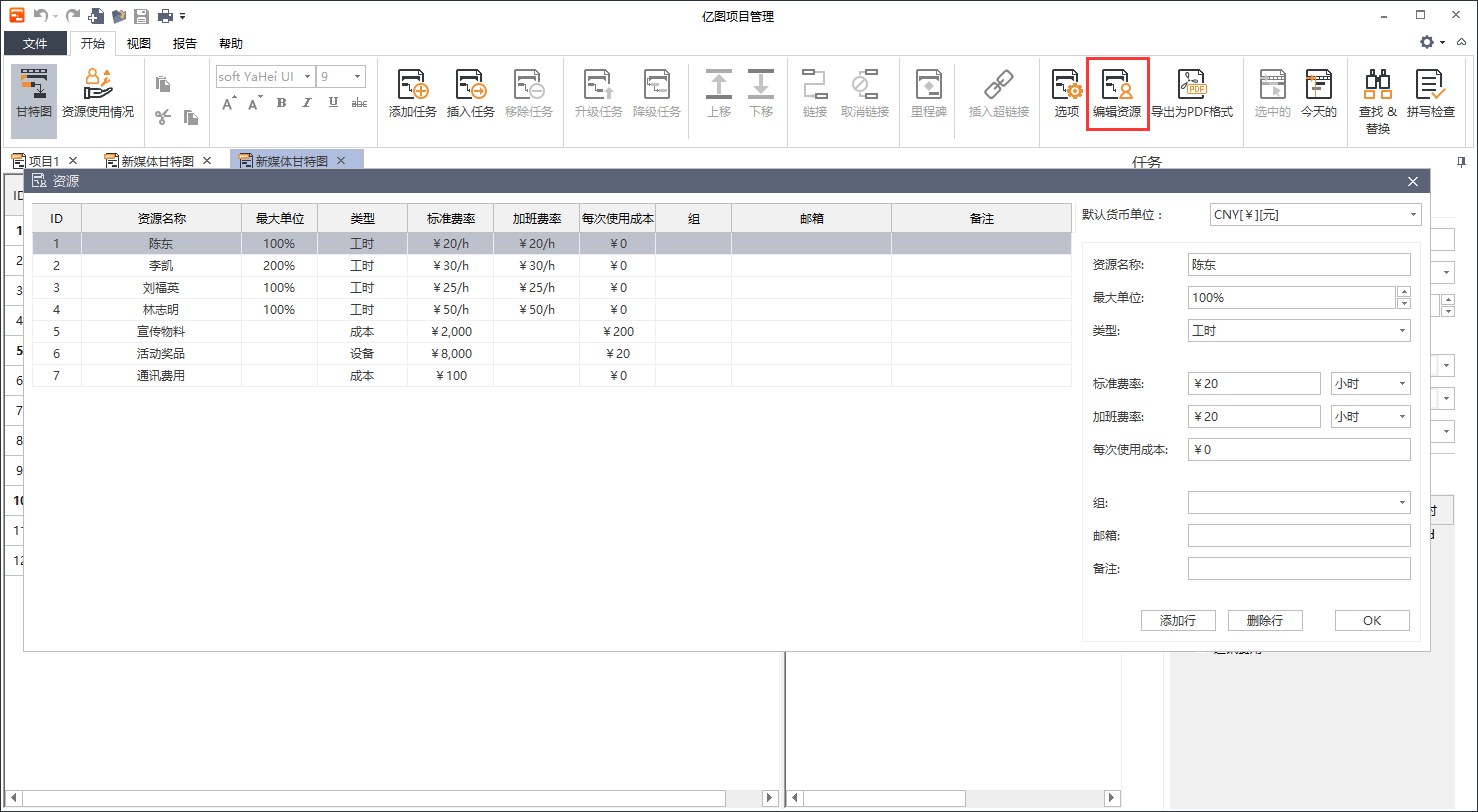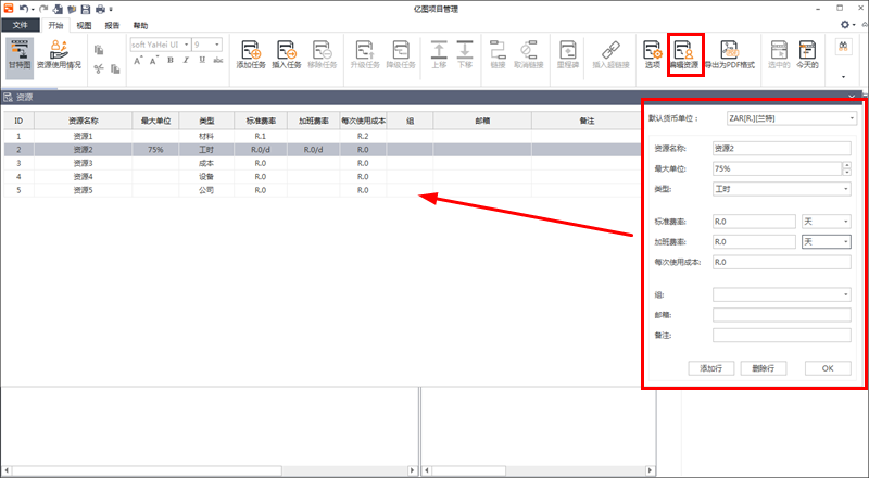 资源编辑功能是一种高级的甘特图功能,项目管理者可以在该面板设置资源的类型,成本价格以及名称等等。一个任务中会包含多个不同的资源,这些资源的组合会生成各类的报告。