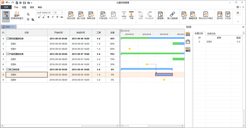 如果你想添加里程碑的子任务,只需要选中项目,然后点击上方的“降级任务”,即可将选中的项目变成子任务。如果你想添加前置任务或后续任务,选中项目后,在右侧的“链接”选项,将前置或后置任务的ID输入,即可将其进行连接。