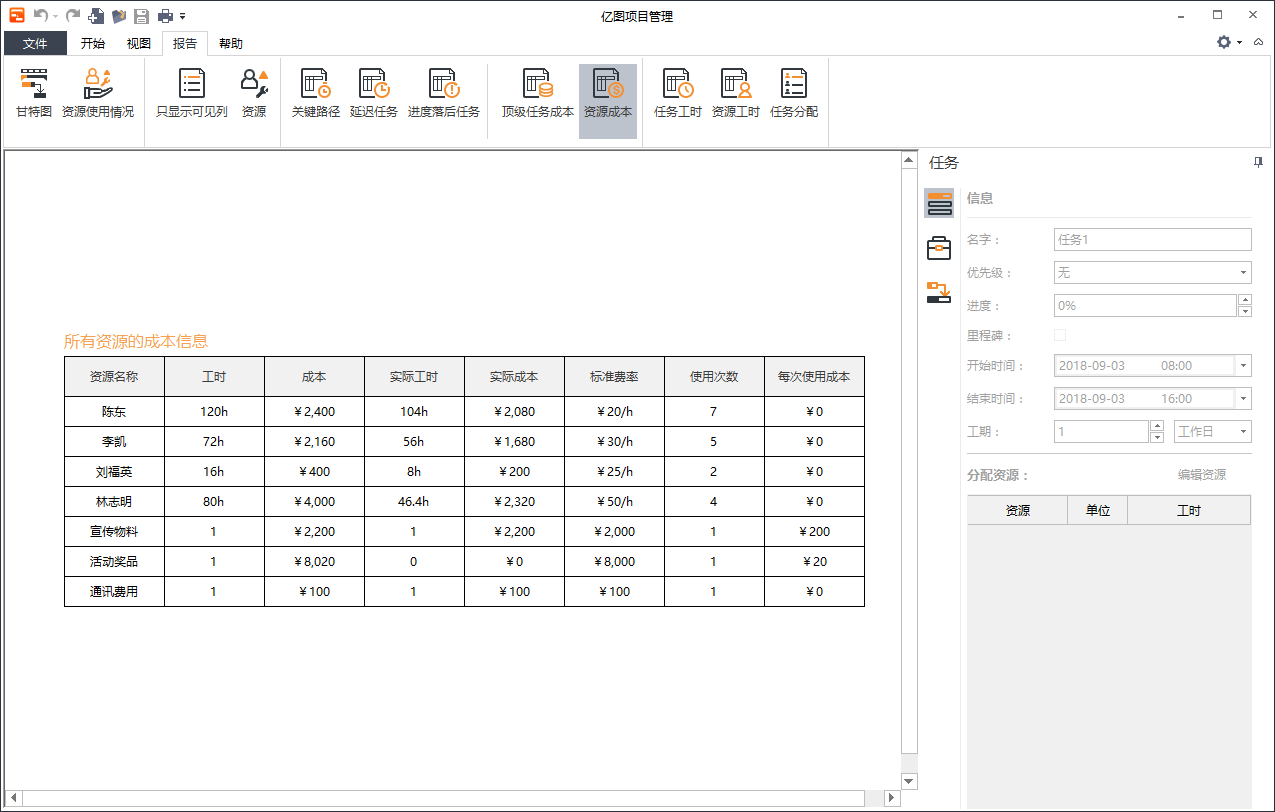 除此之外,点击菜单栏上方的“报告”,还可以查看资源成本的使用情况以及任务工时、延迟任务、任务分配等信息。