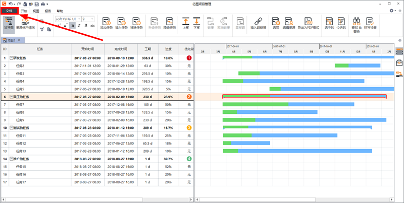 首先,要先将制作好的项目管理甘特图准备好,然后用鼠标点击软件左上方的【文件】。