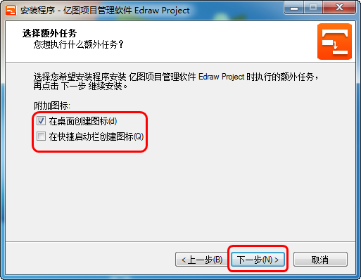 第四步:选择是否在桌面、快捷启动栏创建图标。选择需要显示的图标方式,再点击“下一步”。