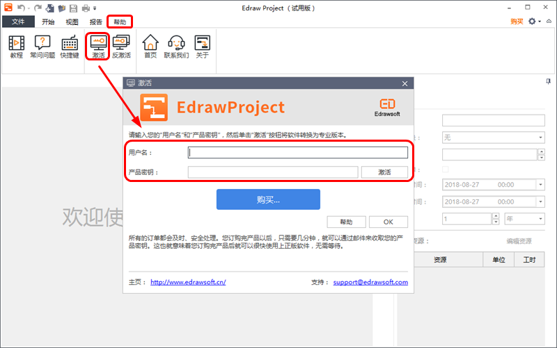 点击“帮助”菜单下的“激活”,并输入对应的用户名和秘钥点击激活,然后重启软件,就能解锁所有付费版的功能。