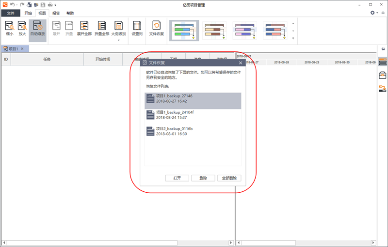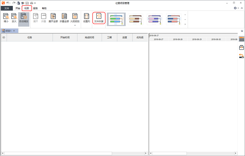 2.在操作界面顶部功能区,选择【视图】-【文件恢复】,这样就能找到近期备份的文件。