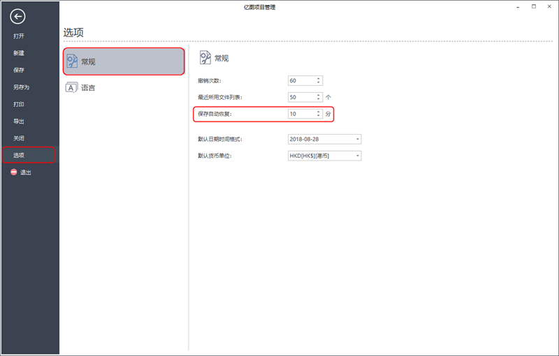 4.在【选项】–【常规】中,你可以根据自己的需求设置Edraw Project项目管理软件的自动备份时间间隔。