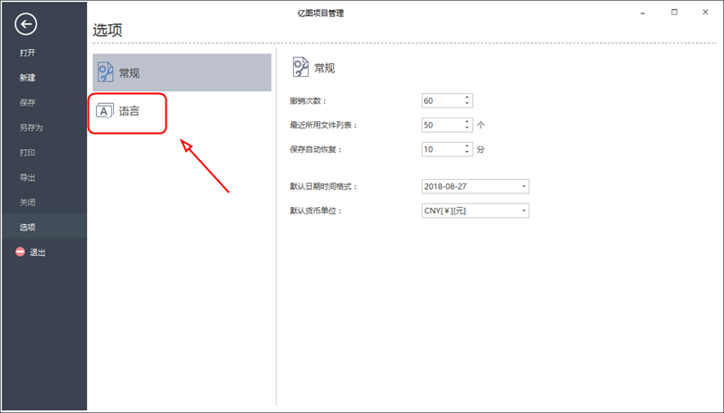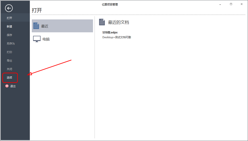 2、打开亿图项目管理软件后,点击“选项”,将界面切换至选项设置。