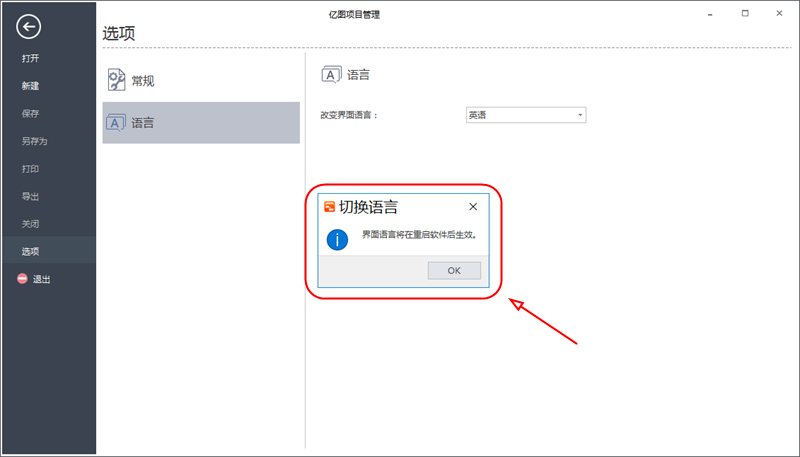 5、选中需要修改的语言后,会弹出一个提示框,点击“OK”,并根据提示重新启动软件。