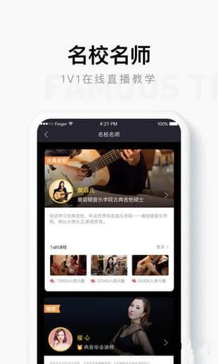 学吉他的朋友手机上必备的神器,Finger吉他app是你的口袋吉他教师,专业的吉他教学,提供你的吉他教室信息,还有30天吉他系统入门和海量的吉他课程,5分种就能了解你的吉他水平。