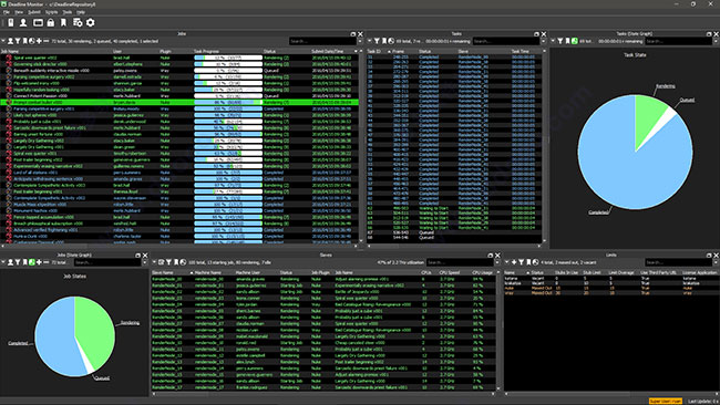 4、作优先权、机器Pools、限制组、特别工作黑名单、等功能允许明确控制分配了的渲染任务,管理不同部门的资源。Deadline提供了非常详细和精确的的任务日志,不仅可以很方便的找到问题的原因,以最快的速度解决问题。而且可以为项目管理人员提供详细的工作数据。