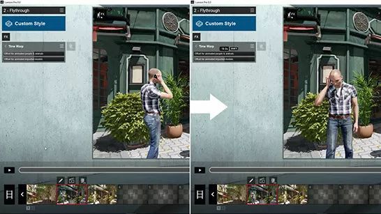 一只海鸥恰好在错误的时刻飞过,一只动画的人的手臂神秘地摆到了建筑的正面.通过Lumion 8中的新的时光隧道效果,您可以实现时间偏移,以移动动画人物,动物和物体的小动作.向后切换时间,或转发.您的动画物体现在将调整其位置,以便在正确的时间以正确的方式完成姿势.