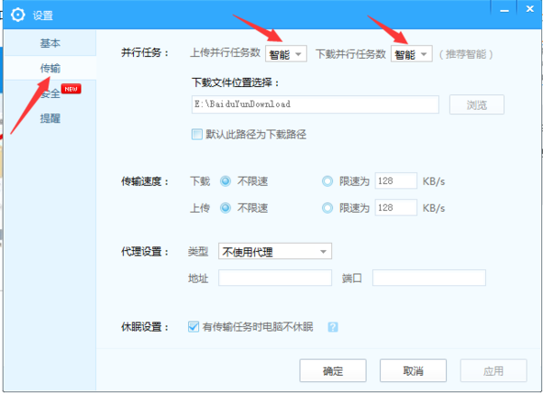 进入设置以后在左列表选择“传输”选项,即可在左选项栏第一项操作下载和上传的数量,默认值为智能,下载数量为1-5,如下图: