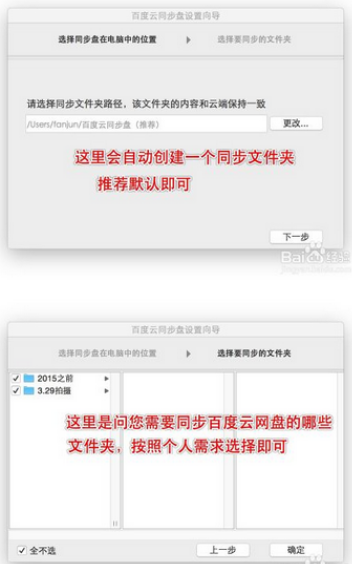 需要在本机创建一个百度云盘的文件夹,推荐默认即可,点击下一步,选择需要网盘同步到电脑中的文件夹,不勾选不会同步。