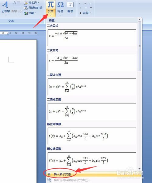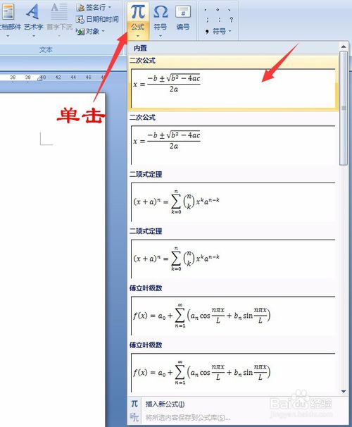 在新建文档中,单击“插入”菜单中“公式”会下拉公式选项,找到需要的公式单击即可。