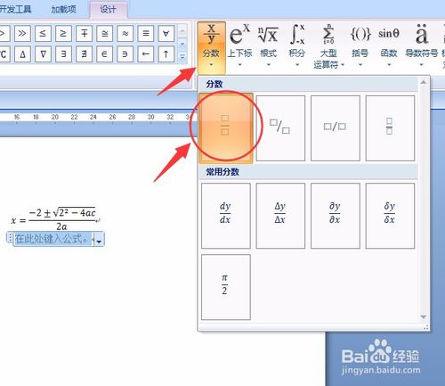分数格式操作,“公式”中单击“分数”下拉中选类型,如图所示: