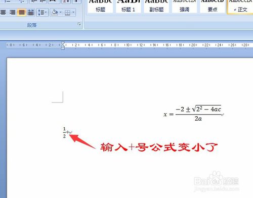 在公式外单击鼠标,再输入+公式数字会变小,选定后再调整大小和调整文字一样调整。