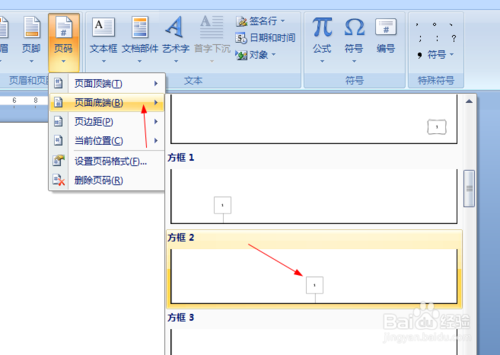 点击页码下的小三角,在弹出菜单中选择页面底端,在里面选择一个合适的模版,因为我要让页码显示在底部,如果你想让页码显示在顶部,可以选择页面顶端。