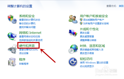 之后我们在控制面板中点击”硬件和声音“选项,如图所示。