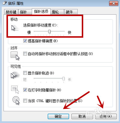 之后我们在里面移动中,可以看到选择指针移动速度的滑块,我们向左滑动可以将鼠标指针移动速度降低,向右滑动将鼠标指针移动速度提高,我们调整完成点击应用或确定即可设置成功,改变鼠标指针的移动速度,如图所示。
