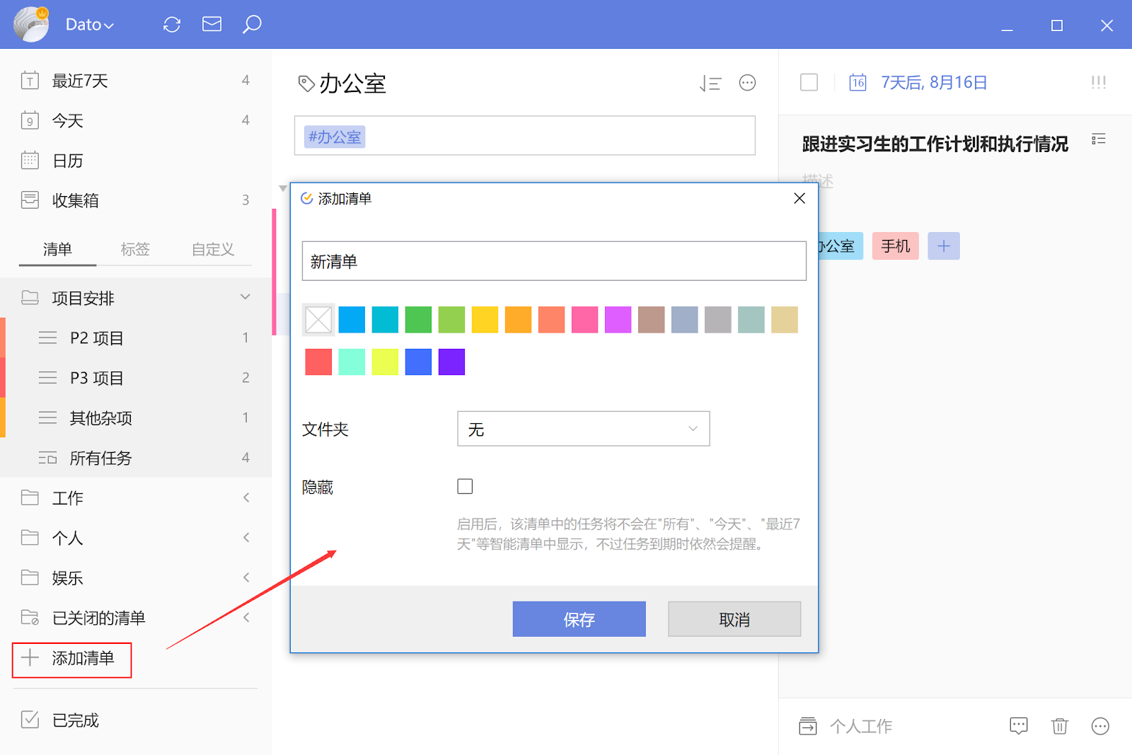 点击左侧边栏的【添加清单】按钮,在弹窗中输入清单名称、设置颜色、清单所属文件夹以及是否隐藏,点击【保存】即可完成创建。