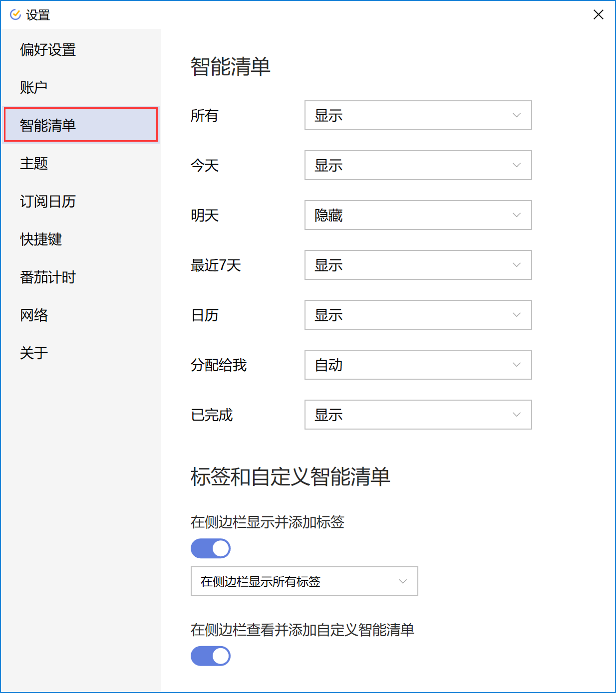点击左上角头像-【设置】-【智能清单】,可以对智能清单的状态进行设置。