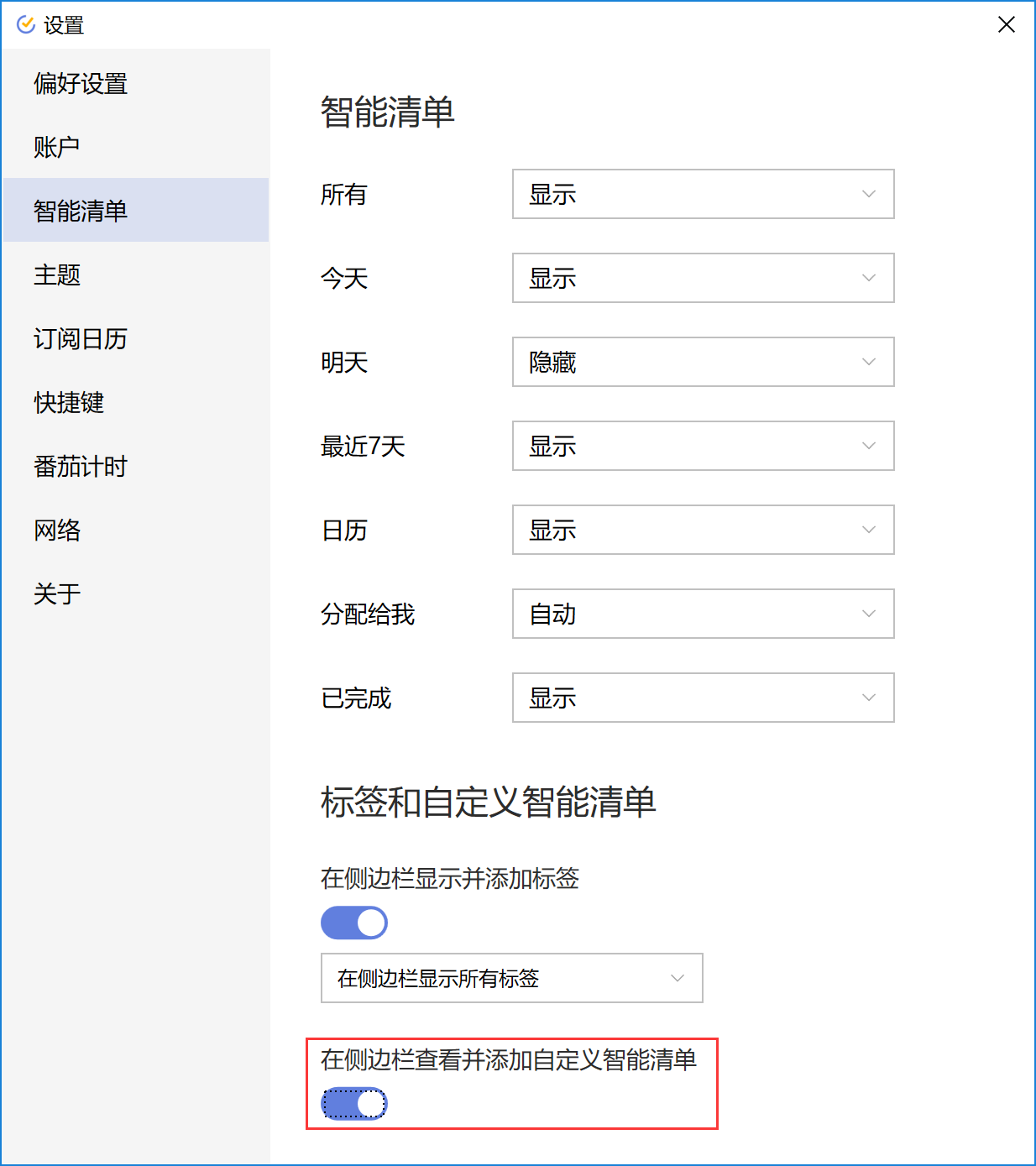 在【设置】-【智能清单】中开启【自定义智能清单】,在左侧边栏的【清单】和【标签】旁边会出现【自定义】。