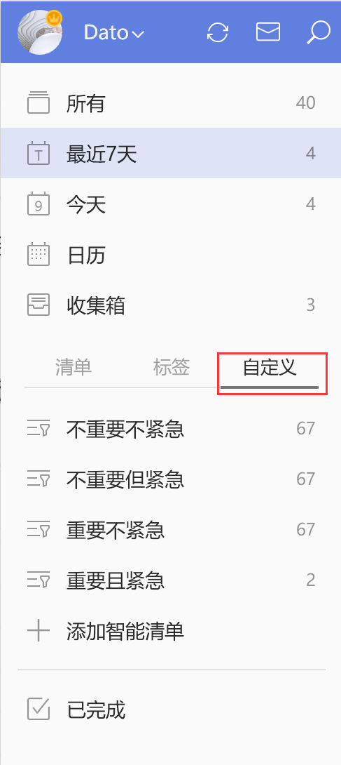 智能清单:滴答清单的默认清单,如【今天】【明天】【最近七天】【收集箱】等;