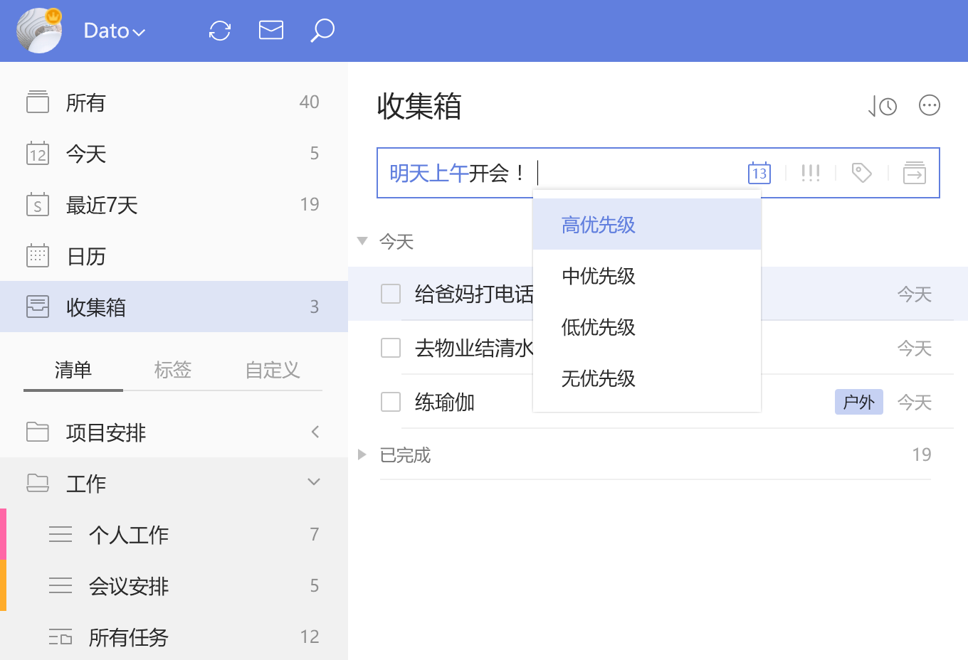 智能识别日期:在输入栏内输入任务,文本中的日期和时间显示高亮,将自动为任务设定到期日和提醒时间。