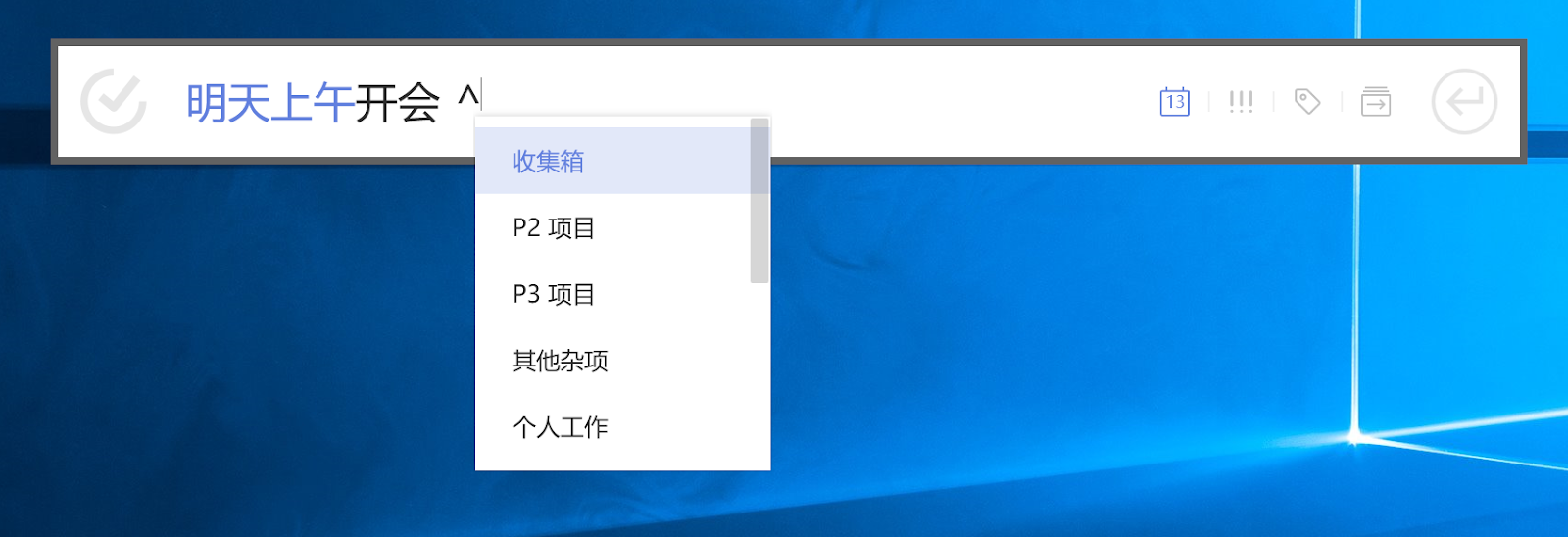 在输入栏内输入「#」,可以为任务指定标签; 在输入栏内输入「^」,可以将任务添加到指定清单; 在输入栏内输入「*」,可以快速为添加的任务设置日期; 在输入栏内输入「!」,可以快速为添加的任务优先级;