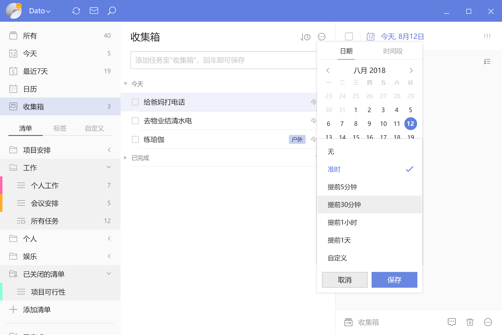 若您在创建任务的时候并未输入任务到期时间,那么您可以点击任务进入右侧详情页,单击日期栏为任务设置到期时间。 设置好到期时间后,可以为任务设置提醒。
