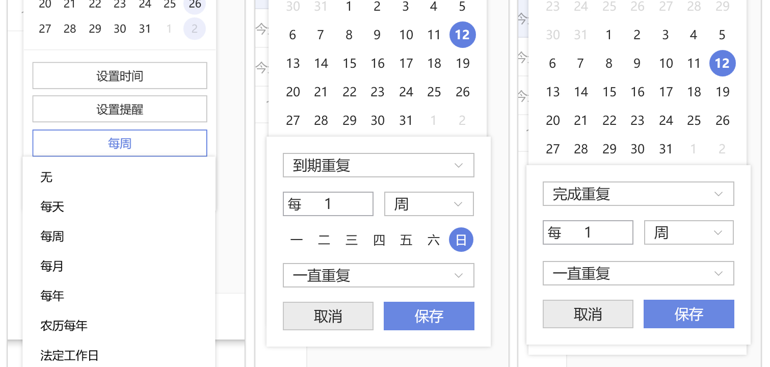 支持【每天】、【每周】、【每月】、【每年】、【农历每年】重复;点击自定义, 可以更为个性化的设置重复,例如【每周二】或【每个月的第三个周五】。 目前支持【到期重复】和【完成重复】两种重复模式。