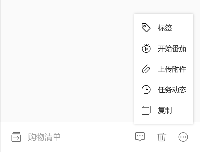 【更多】中包括: 1、【标签】:为当前任务添加标签 2、【开始番茄】:打开番茄计时,并开始专注 2、【上传附件】:滴答清单支持上传相册中的照片,音频和经常使用的文件类型如 word,excel 等。