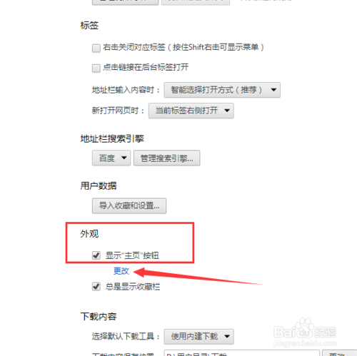 向下拉,找到显示主页勾选一下,并点击更改。