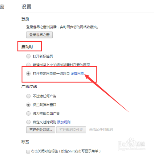 然后再向上拉,找到【启动时】选择【打开特定网页或者一组网页】