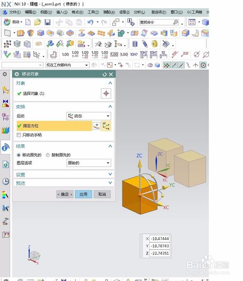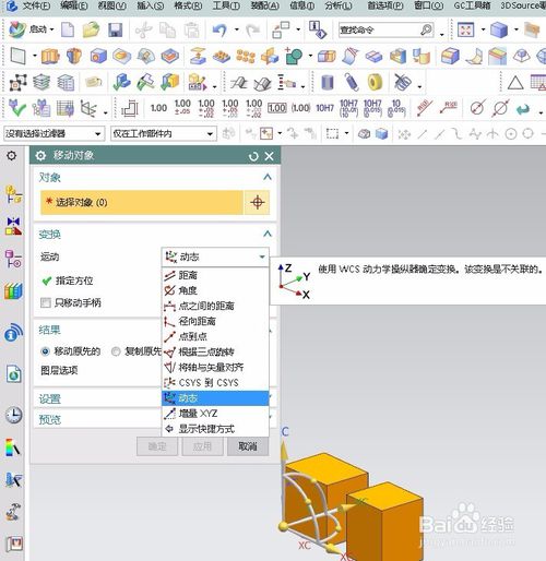 7.选择动态这种方法,就会出现一个坐标,选择体后,只要移动坐标,体就跟着移动,想移动到哪,坐标就放到那,要注意把只移动手柄这个选项的小勾去掉,不然只会移动坐标,不移动零件。