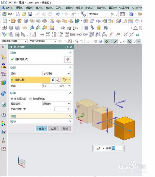 4.第一步选择要移动的对象,第二步选择移动的方法,以距离这个方法为例,用距离这种方法要选择移动的方向,也就是指定移动矢量,然后输入要移动的距离,在结果栏里选择移动原先还是复制原先,移动原先的意思是,把整个块移动走,不保留,复制原先就是,原来的块保留,复制一个移动走,最后单机确定即可。