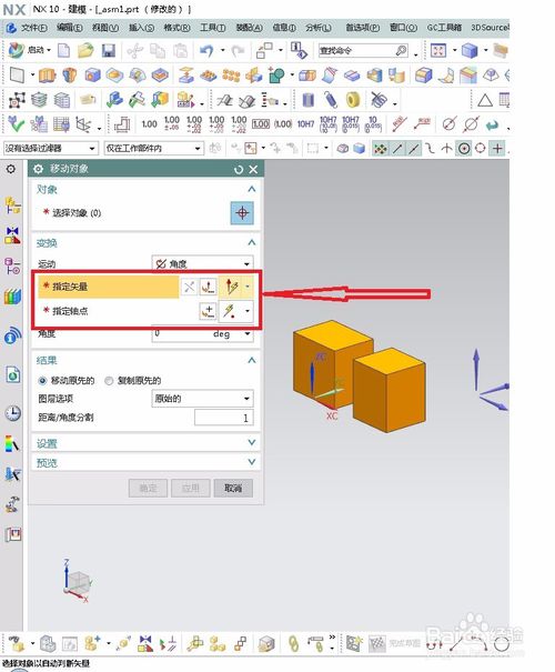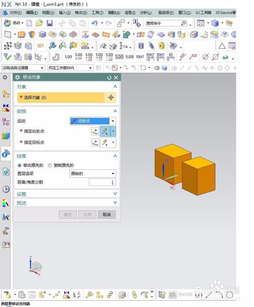 5.其它的方法类似于距离这种方法,每一种方法都需要选择对象和结果,下面注意将方法的含义。点到点,就是把体上的某一点,移动到另外的一定上,如图: