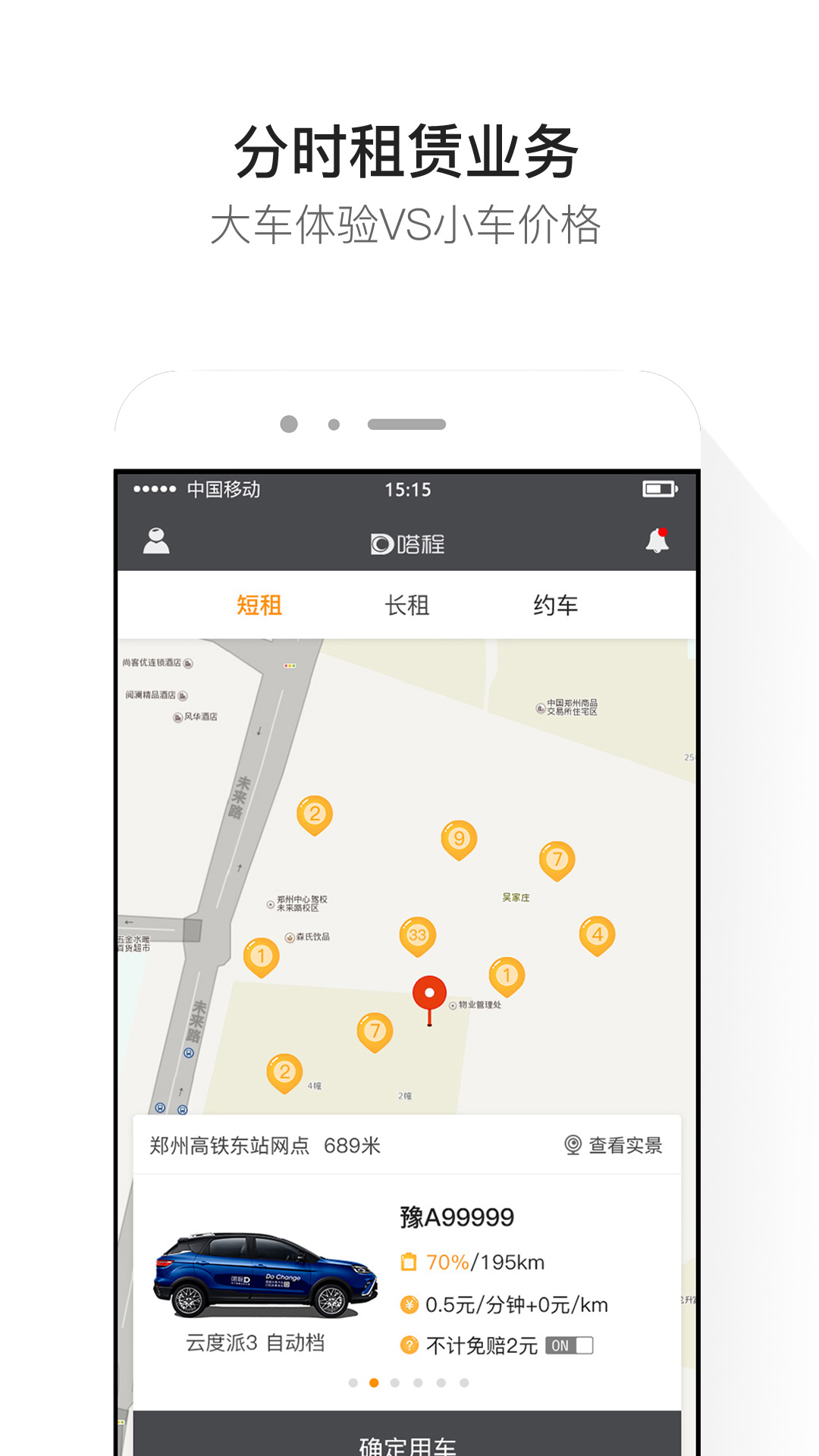 嗒程app用车押金低至299元,5元不计免赔,红包车,A2B定点取还、通行线路自由选择。