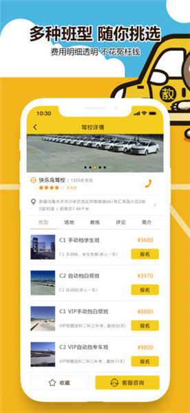 线上优惠:通过兜兜学车APP线上报名学车,可享比驾校更优惠的价格。周边驾校:可根据定位自动搜寻周边驾校,轻松了解身边驾校环境,驾校教练评价,驾校班型费用等,提高学车人士选择驾校效率。