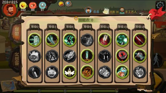 ①无 1技能点:0级抵抗,3级怒气速度,6级经验加成,9级工作成功率,12级暴击伤害(局势很差12,15都可以点食物),15级点回9级的力量武器(或留点),18级护甲(和攻击)