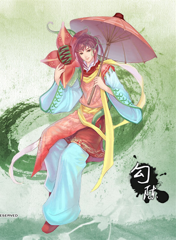 勾陈:原为上古六神之一。俊秀瑰丽、俏美如花、巧笑吟吟、个性飘忽、时笑时嗔、时善时恶、男女莫辨。美丽的笑颜下隐藏着深不可测的实力,与句芒长相近似,两人似乎有某种程度的关系,别号“绯花修罗”。