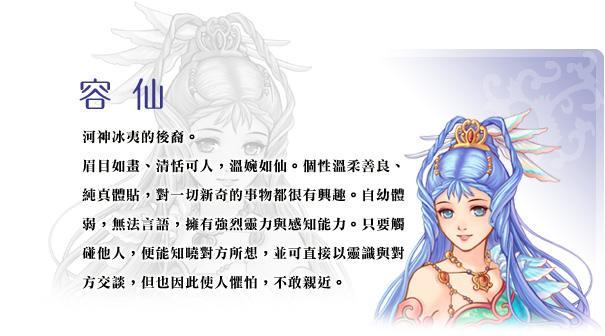 河神冰夷的后裔。眉目如画,清恬可人,温婉如仙。个性温柔善良,纯真体贴,对一切新奇的事物都很有兴趣。