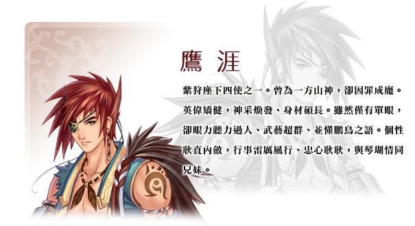 紫狩座下四使之一。曾为一方山神,与凡女桂馨相恋,后因罪成魔。其父被白萤所杀。曾英伟矫健,神采焕发,身材硕长。虽仅有单眼,却眼力听力过人,
