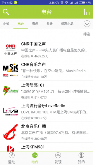 可以一边跑步,一边收听在线电台及网络电台,也可以在线播放或者下载到本地;