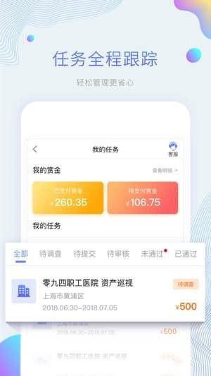 平安好差事APP是平安租赁推出的在标准化操作、数据化评估基础上有效提升管理效率和降低运营成本的移动服务平台。平安好差事APP主要提供调查任务的发布、抢单、执行任务、填写调查报告、任务状态查询等功能。