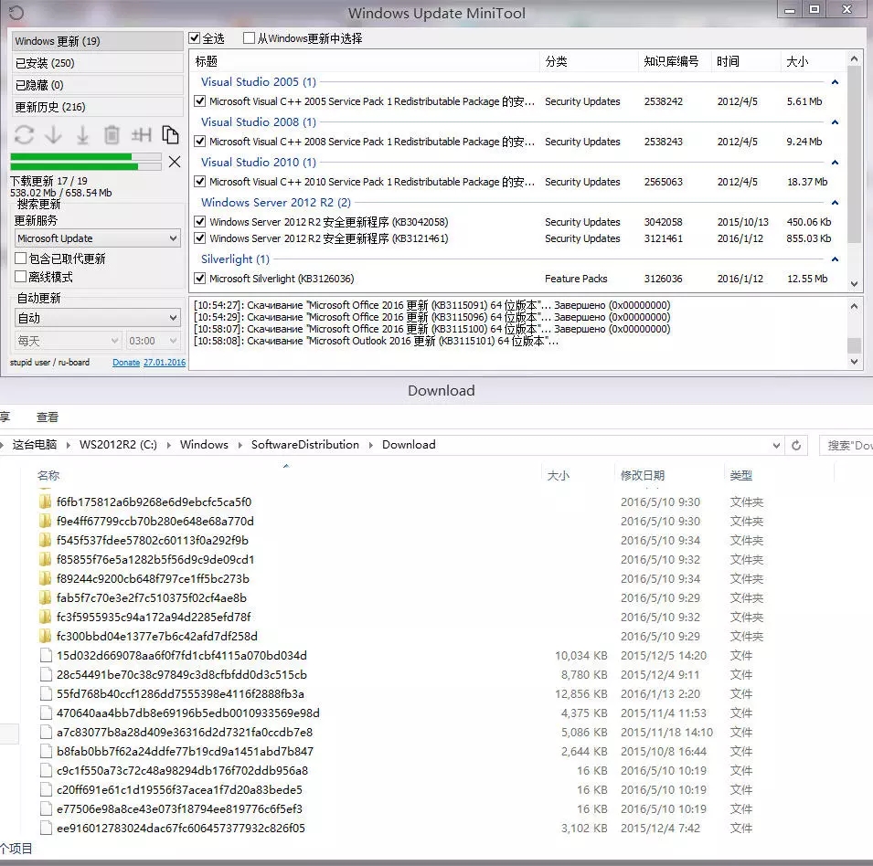 Windows Update MiniTool 将更新补丁下载到「C:\Windows\SoftwareDistribution\Download」(系统盘符C)中。如图和Windowsupdate一样,下载完成的更新补丁已经「解压」了,所以要保存更新补丁的同学只能使用上面f,一个一个复制下载了。